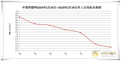2020年2月24日,据中国养猪网猪价系统监测全国外三元均价为37.44元/公斤,价格较昨日下跌了0.14元/公斤。上周全国外三元均价为38.66元/公斤,今日较上周下跌了1.22元/公斤。内三元均价为36.14元/公斤,较昨日下跌了0.14元/公斤。土杂猪均价为35.57元/公斤,价格较昨日下跌了0.07元/公斤