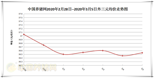 2020年3月5日,据中国养猪网猪价系统监测全国外三元均价为36.54元/公斤,价格较昨日上涨了0.08元/公斤。上周全国外三元均价为37.11元/公斤,今日较上周下跌了0.57元/公斤。内三元均价为35.73元/公斤,较昨日下跌了0.03元/公斤。土杂猪均价为35.09元/公斤,价格较昨日下跌了0.04元/公斤。