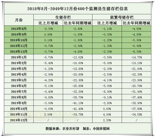 受非洲猪瘟疫情影响,我国生猪产能受到冲击,具体遭受的影响有多大。我们根据官方监测数据来看,2018年8月至2019年12月,我国生猪生产情况如下: