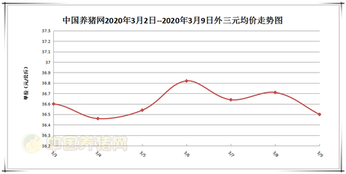 2020年3月9日,据中国养猪网猪价系统监测全国外三元均价为36.50元/公斤,价格较昨日下跌了0.21元/公斤。上周全国外三元均价为36.55元/公斤,今日较上周下跌了0.05元/公斤。内三元均价为35.81元/公斤,较昨日下跌了0.33元/公斤。土杂猪均价为35.25元/公斤,价格较昨日下跌了0.36元/公斤。