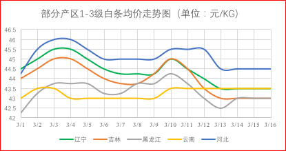从辽宁、吉林、黑龙江、云南、河北等产区1-3级白条主流批发价格来看,吉林、辽宁、云南、河北、黑龙江地区白条价格呈现稳定态势,白条价格企稳对猪价企稳也将形成利好作用。