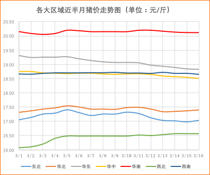 目前国内各大区域猪价差异化表现明显,华东、华中地区猪价呈现下跌态势,东北、华北地区地区猪价呈现微幅上涨态势,华南、西北、西南地区猪价呈现稳定,猪价调整现象明显有所减弱,华南高价与西北低价价差开始出现明显企稳态势。