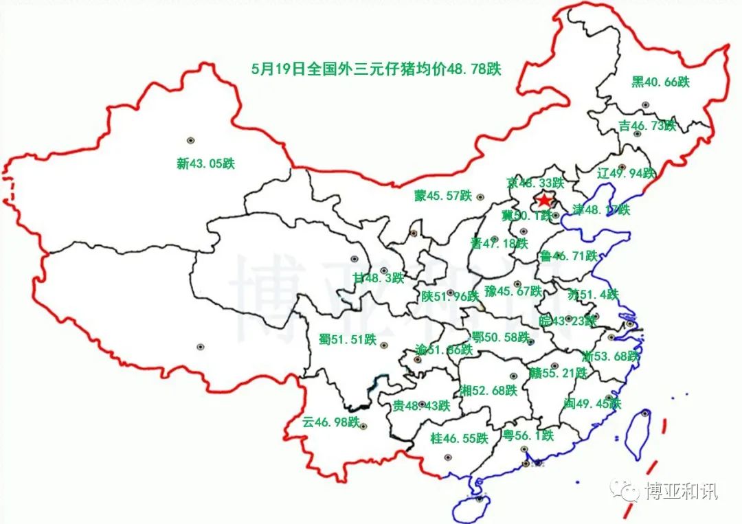 据博亚和讯监测,2020年5月19日全国外三元生猪均价为27.28元/公斤,较昨日上涨0.15元/公斤;仔猪均价为97.56元/公斤,较昨日下跌1.69元/公斤;白条肉均价35.74元/公斤,较昨日上涨1.78元/公斤。今日猪料比价为9.64,较昨日增加0.05。