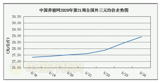 据中国养猪网猪价系统数据显示,上周(2020年05月18日至2020年05月24日)全国生猪价格外三元)均价走势持续上涨,周初猪价为27.32元/公斤,周末猪价为28.91元/公斤,猪价累计上涨了1.59元/公斤。