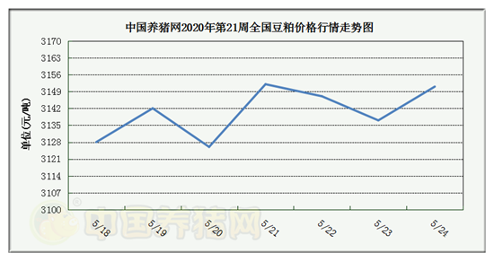 据中国养猪网猪价系统数据显示,上周(2020年05月18日至2020年05月24日)豆粕价格涨跌走势稳定,全国涨跌幅度互补。周初豆粕价格为3128元/吨,周末豆粕价格为3151元/吨,上周豆粕价格上涨了23元/吨。