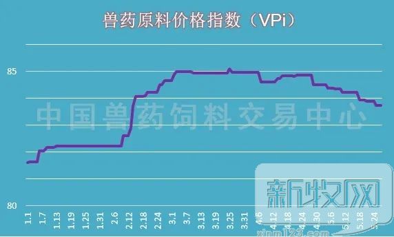 27日,兽药原料价格指数(VPi)为83.74,指数继续小幅回落。VPi指数显示兽药需求没有明显放大迹象,兽药原料市场维持偏弱格局。