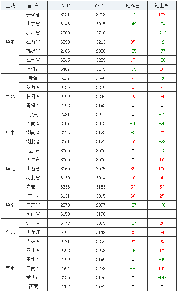 豆粕均价(饲料原料)后十:浙江省2700元/吨、西藏自治区2752元/吨、广东省2870元/吨、福建省2963元/吨、北京市3000元/吨、天津市3000元/吨、河北省3030元/吨、山东省3046元/吨、河南省3067元/吨、辽宁省3078元/吨。