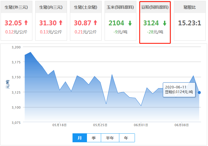 2020年06月11日,今日全国豆粕均价为3124元/吨,价格较昨日下跌了28元/吨。