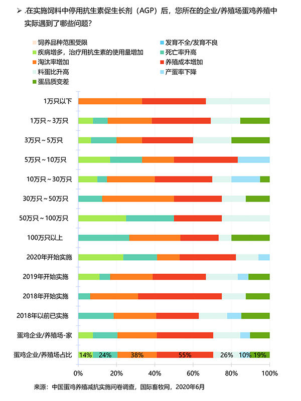 然而,在减抗、禁抗情况下这种现象显得更为明显,按照国际畜牧网近期就减抗问题初步收集的问卷调查和回访结果数据显示,在接受调查的57家蛋鸡企业/养殖场中,实施饲料中停用抗生素促生长剂(AGP)后,它们遇到最多的问题是“养殖成本增加”,其次是“淘汰率增加”,以及“疾病增多,治疗用抗生素的使用量增加”、“蛋品质变差”。比较来看,遇到“料蛋比升高”、“死亡率升高”、“产蛋率下降”问题的企业/养殖场较少,而遇到“饲养品种范围受限”、“发育不良”、“蛋均重下降”问题的更少。