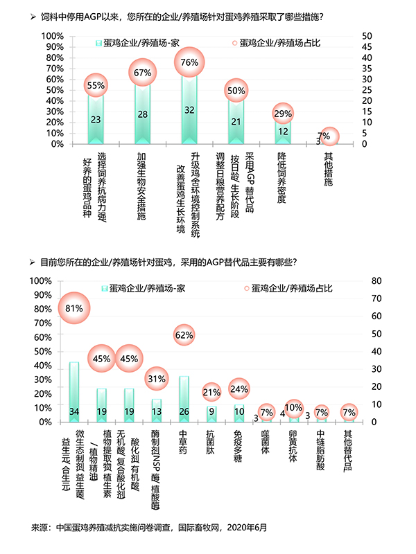 从实施减抗采取的方式来看,“升级鸡舍环境控制系统,改善蛋鸡生长环境”、“加强生物安全措施”分别居于第一和第二位;“选择饲养抗病能力强的蛋鸡品种”和“采用AGP替代品,按日龄/生长阶段调整日粮营养配方”并列第三。在这些蛋鸡企业/养殖场采用的AGP替代品中,微生态制剂(益生菌/益生元/合生元)占比最高,其次是中草药、酸化剂(有机酸/无机酸/复合酸化剂) 、植物提取物(植生素/植物精油)、酶制剂(NSP酶/植酸酶) ,采用抗菌肽、免疫多糖、噬菌体、卵黄抗体、中链脂肪酸的占比较少。