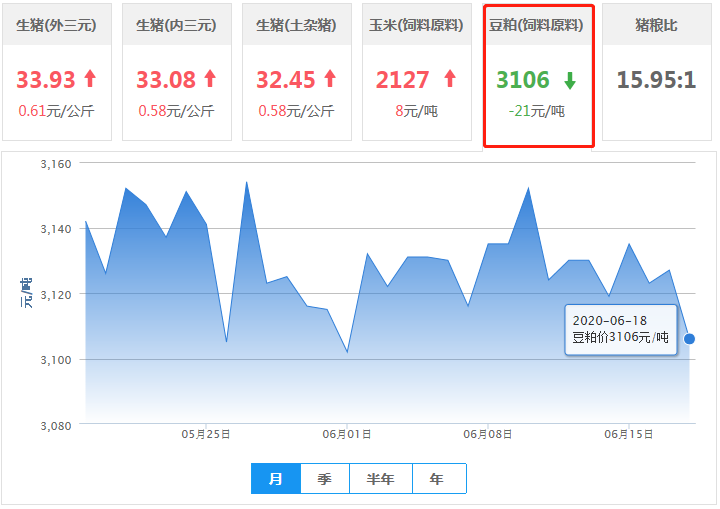 2020年06月18日,今日全国豆粕均价为3106元/吨,价格较昨日下跌了21元/吨!