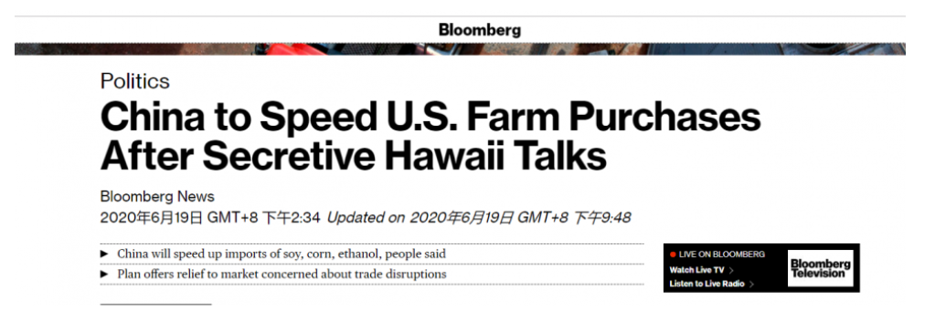 另据彭博社报道,在夏威夷会议后,中国已经加快采购美国农产品的步伐。