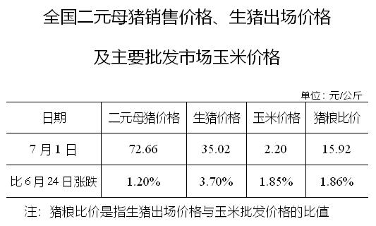 官方数据显示,截止2020年7月1日,我国二元母猪销售价格为72.66元/公斤,较6月24日上涨了1.20%。