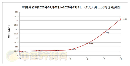 2020年07月08日(星期三),据中国养猪网猪价系统监测全国外三元均价为38.09元/公斤,猪价较昨日(37.30元/公斤)上涨0.79元/公斤,数据显示今日我国外三元生猪价格再次大幅上涨,昨日猪价突破“37元”,今日在上新高度!