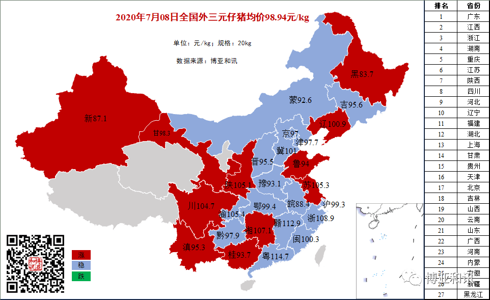 2020年7月8日全国外三元生猪均价为38.02元/公斤,较昨日上涨0.77元/公斤;仔猪均价为98.94元/公斤,较昨日上涨0.04元/公斤;白条肉均价51.17元/公斤,较昨日上涨1.38元/公斤。今日猪料比价为13.39,较昨日增加0.27。