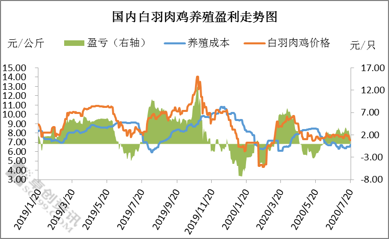 2020年6月初国内白羽肉鸡养殖由亏转盈,截至7月20日,国内白羽肉鸡养殖持续处在盈利阶段,6-7月国内白羽肉鸡养殖利润2.32元/只,环比涨幅486.67%,同比涨幅309.01%。从肉鸡销售价格来看,6-7月国内白羽肉鸡市场供求稳定,鸡价在3.60-4.00元/斤稳中盘整,波动空间十分有限。从养殖成本来看,得益于毛鸡市场供求稳定,上游鸡苗市场波动空间不大,鸡苗均价持续处在3.00元/羽以下,区内饲料价格虽有走高,对单只肉鸡养殖成本影响程度有限。综上所述,肉鸡养殖成本与销售价格运行稳定,养殖户补栏热情趋稳,6-7月肉鸡养殖利润稳定在2.00-3.00元/只。