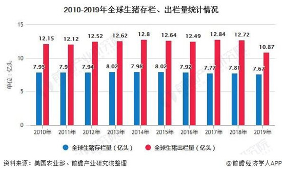 中国为全球猪肉产量和消费量最高的国家,2018年非洲猪瘟导致中国生猪产量大幅下降。根据美国农业农业部的数据显示,2019年全球生猪产量为10.4亿头,降至自2013以来的最低水平,较2018年同比下降18.26%。