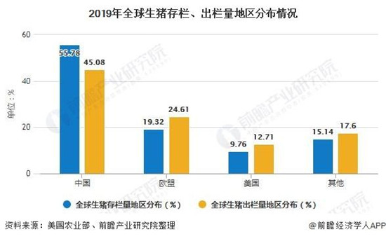 从出栏量来看,2019年全球生猪出栏量为1087亿头,较2018年同比下降14.56%,其中,中国生猪出栏量占全球的比重为45.08%,较2018年下降了8.8个百分点。欧盟和美国生猪出栏量市场份额较2018年有显著提升,占比分别为24.61%和12.71%。