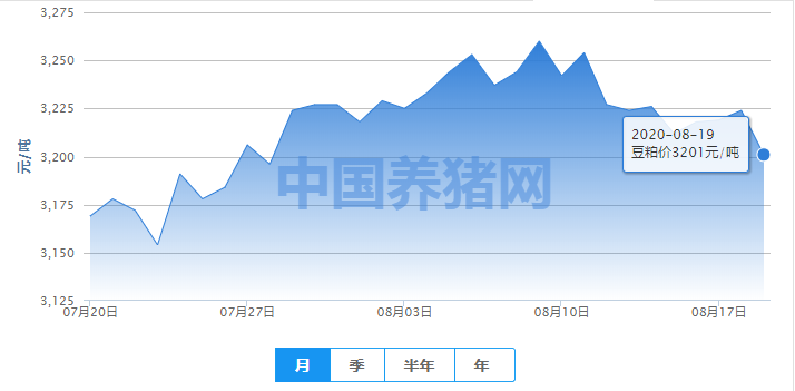 2020年08月19日(星期三),今日全国豆粕均价为3201元/吨,报价与昨日下跌23元/吨,报价较上周下跌了26元/吨,较上月上涨了32元/吨!