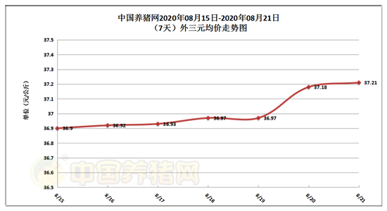 2020年08月21日(星期五),据中国养猪网猪价系统监测全国外三元均价为37.21元/公斤,猪价与昨日(37.18元/公斤)上涨了0.03元/公斤,较上月下跌了0.21元/公斤。