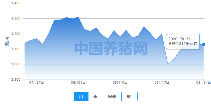 豆粕均价(饲料原料)前十:海南省3587元/吨、新疆维吾尔自治区3585元/吨、四川省3490元/吨、吉林省3426元/吨、云南省3379元/吨、宁夏回族自治区3360元/吨、陕西省3336元/吨、内蒙古自治区3310元/吨、重庆市3310元/吨、贵州省3229元/吨。
