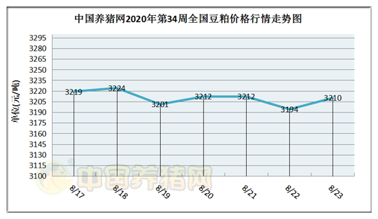 据中国养猪网猪价系统数据监测,2020年第34周(2020年08月17日至2020年08月23日)豆粕价格整体行情偏稳,涨跌幅度均较小。周初豆粕价格为3219元/吨,周末价格为3210元/吨,全周豆粕价格累计下跌了9元/吨。