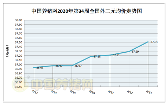 据中国养猪网猪价系统数据监测,2020年第34周(2020年08月16日至2020年08月23日)全国呈现“阶梯式”上涨,猪价行情在36.93-37.51元/公斤区间之内徘徊!周初猪价为36.93元/公斤,周末猪价为37.51元/公斤,全周猪价累计上涨了0.53元/公斤。