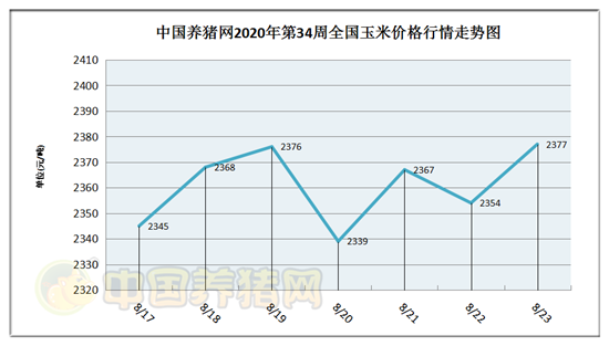 据中国养猪网猪价系统数据监测,2020年第34周(2020年08月17日至2020年08月23日)玉米价走势震荡运行,周初与周末玉米行情呈现上涨走势,周中有明显下跌。周初玉米价为2345元/吨,周末价格为2377元/吨,全周玉米价累计上涨了32元/吨。