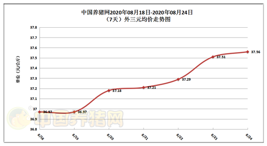 2020年08月24日(星期一),据中国养猪网猪价系统监测全国外三元均价为37.56元/公斤,猪价与昨日(37.51元/公斤)上涨了0.05元/公斤,较上月上涨了0.53元/公斤。