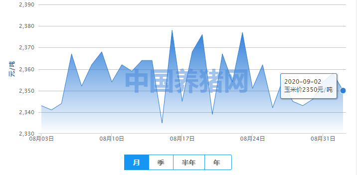 2020年09月02日(星期三),今日全国玉米均价为2350元/吨,报价较昨日下跌8元/吨,报价较上周上涨8元/吨,较上月上涨了7元/吨。