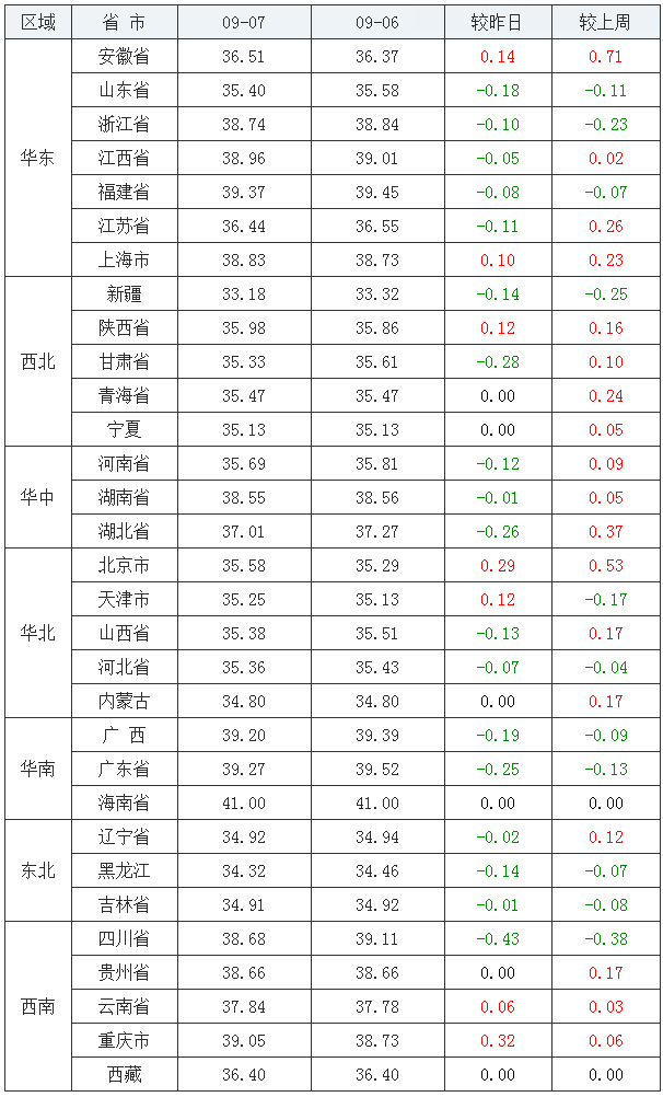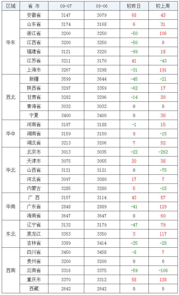 2020年09月07日全国内三元均价涨跌表