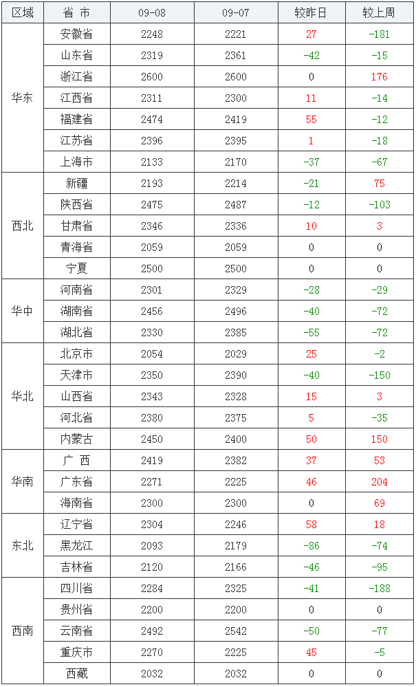 玉米均价(饲料原料)前十:浙江省2600元/吨、宁夏回族自治区2500元/吨、云南省2492元/吨、陕西省2475元/公斤、福建省2474元/吨、湖南省2456元/吨、内蒙古自治区2450元/吨、广西壮族自治区2419元/吨、江苏省2396元/吨、河北省2380元/吨。