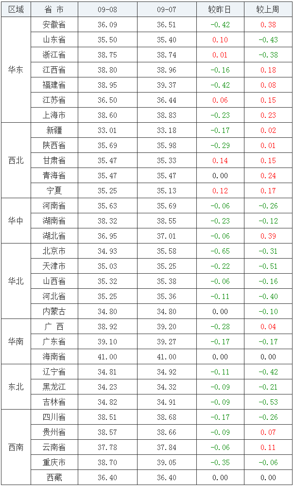 2020年09月08日(星期二)中国养猪网猪价系统数据监测如下: