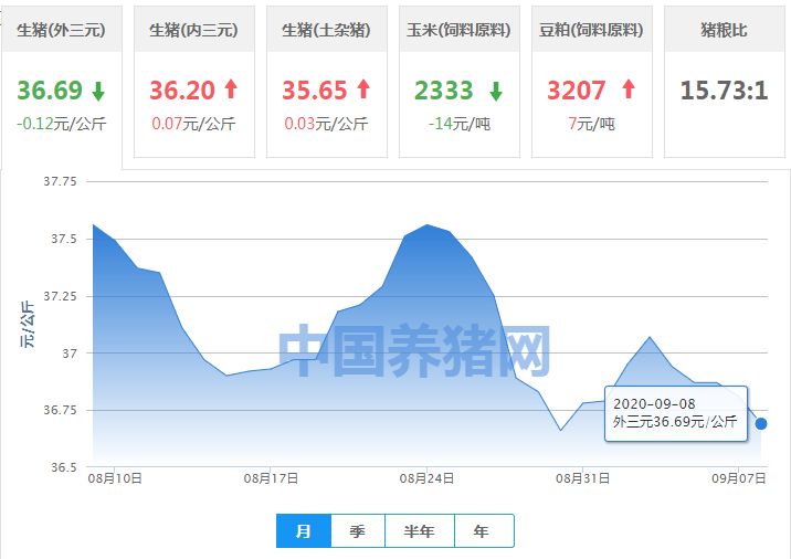 生猪(品种:外三元)均价为36.69元/公斤,价格较昨日下跌了0.12元/公斤。