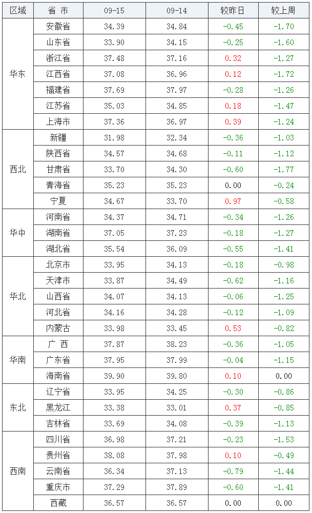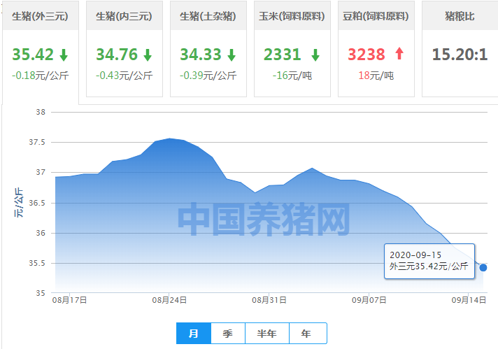 2020年09月15日(星期二)中国养猪网猪价系统数据监测如下: