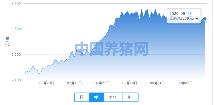 2020年09月17日(星期四),今日全国玉米均价为2339元/吨,报价较昨日下跌1元/吨,报价较上周下跌11元/吨,较上月下跌了29元/吨。
