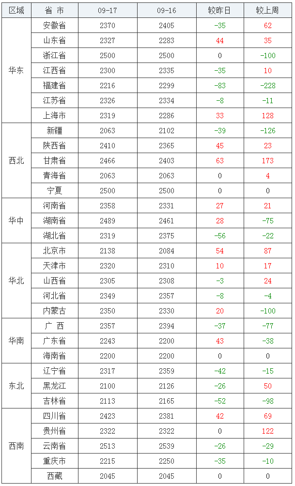 玉米均价(饲料原料)前十:云南省2513元/吨、宁夏回族自治区2500元/吨、浙江省2500元/吨、湖南省2489元/吨、甘肃省2466元/吨、四川省2423元/吨、陕西省2410元/吨、安徽省2370元/吨、河南省2358元/吨、广西壮族自治区2357元/吨。