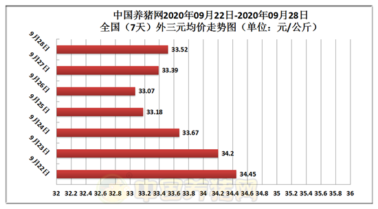 2020年09月28日(星期一),据中国养猪网猪价系统监测全国外三元均价为33.52元/公斤,猪价与昨日(33.39元/公斤)上涨了0.13元/公斤,较上月下跌了3.37元/公斤。