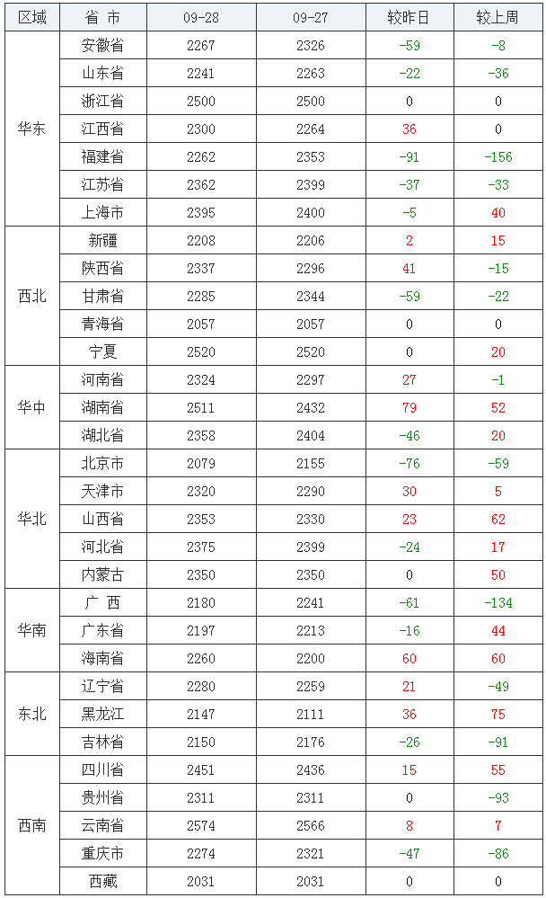 玉米均价(饲料原料)前十:云南省2574元/吨、宁夏回族自治区2520元/吨、湖南省2511元/吨、浙江省2500元/吨、四川省2451元/吨、上海市2395元/吨、河北省2375元/吨、江苏省2362元/吨、湖北省2358元/吨、山西省2353元/吨;
