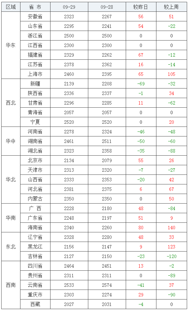 玉米均价(饲料原料)前十:云南省2533元/吨、宁夏回族自治区2520元/吨、浙江省2500元/吨、四川省2464元/吨、湖南省2461元/吨、上海市2460元/吨、河北省2381元/吨、江苏省2378元/吨、内蒙古自治区2350元/吨、海南省2340元/吨;