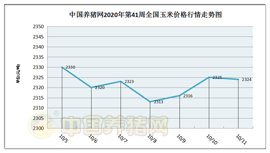 据中国养猪网猪价系统数据监测,2020年第41周(2020年10月05日至2020年10月11日)我国玉米行情震荡运行,全周玉米价格区间在2313-2330元/吨,周初玉米价格为2330元/吨,周末价格为2324元/吨,全周玉米价格累计下跌了6元/吨。