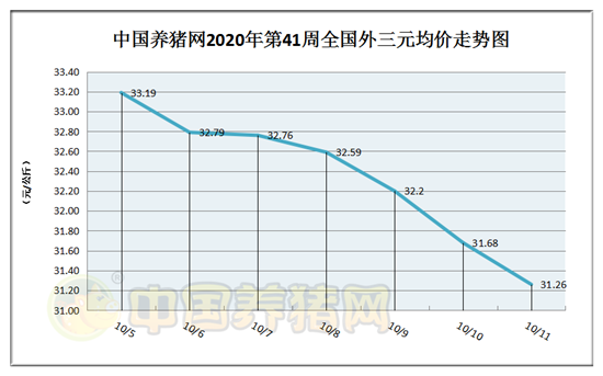 据中国养猪网猪价系统数据监测,2020年第41周(2020年10月05日至2020年10月11日)全国外三元生猪价格走势全部下跌,无一上涨行情!猪价行情在31.26-33.19元/公斤区间之内徘徊!周初猪价为33.19元/公斤,周末猪价为31.26元/公斤,全周猪价累计下跌了1.93元/公斤。
