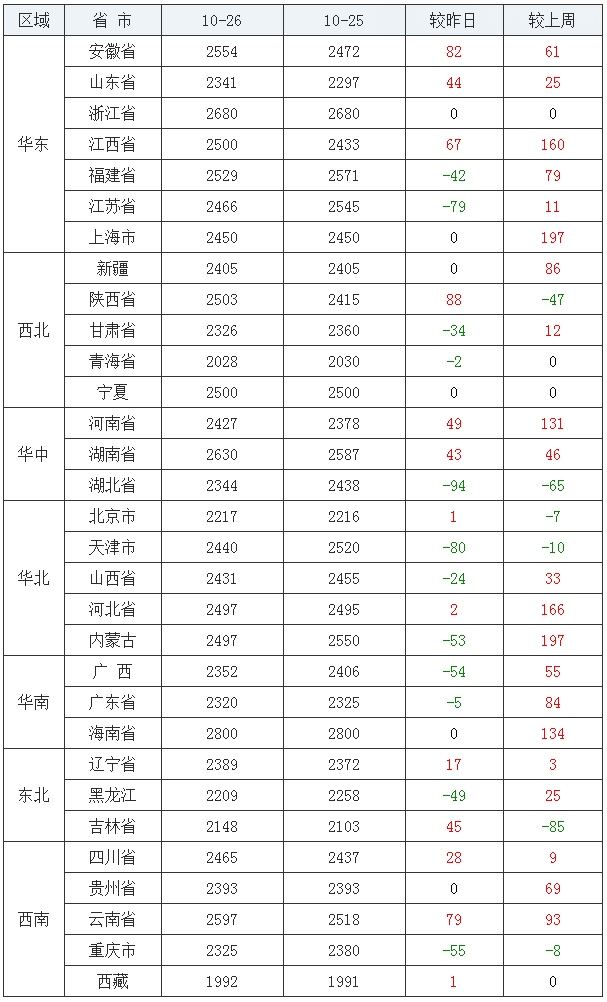 玉米均价(饲料原料)前十:海南省2800元/吨、浙江省2680元/吨、湖南省2630元/吨、云南省2537元/吨、安徽省2597元/吨、福建省2529元/吨、陕西省2503元/吨、宁夏回族自治区2500元/吨、江西省2500元/吨、内蒙古自治区2497元/吨;