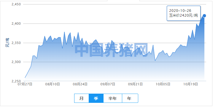 2020年10月26日,今日全国玉米均价为2420元/吨,报价较昨日上涨了1元/吨。