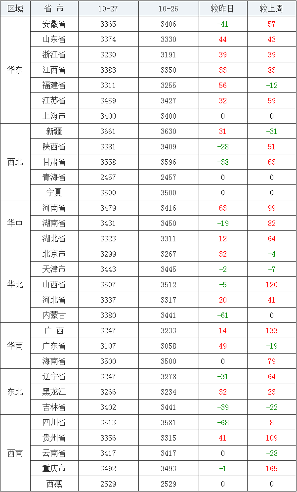 豆粕均价(饲料原料)前十:新疆维吾尔自治区3661元/吨、甘肃省3558元/吨、四川省3513元/吨、山西省3507元/吨、宁夏回族自治区3500元/吨、海南省3500元/吨、重庆市3492元/吨、河南省3479元/吨、江苏省3459元/吨、天津市3443元/吨;