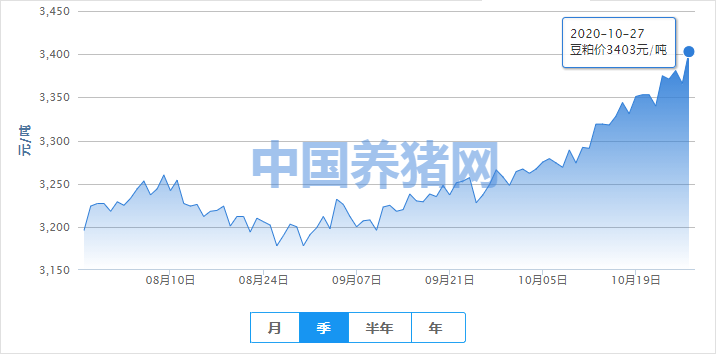 2020年10月27日,今日全国豆粕均价为3403元/吨,报价较昨日上涨37元/吨。