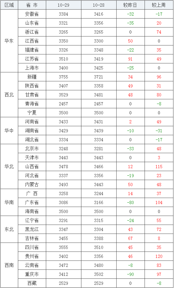 豆粕均价(饲料原料)前十:新疆自治区3755元/吨、四川省3555元/吨、甘肃省3529元/吨、江苏省3510元/吨、海南省3500元/吨、宁夏回族自治区3500元/吨、内蒙古自治区3493元/吨、山西省3478元/吨、云南省3472元/吨、吉林省3455元/吨。