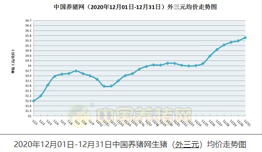 2020年12月31日,中国养猪网猪价系统数据监测显示,全国生猪平均价格为35.67元/公斤,较前一日上涨了0.19元/公斤。