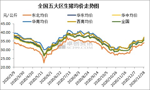 这已经是2020年第三次生猪价格逼近高点。根据农业农村部数据,2020年2月,生猪价格达到最高点,突破38元/公斤的水平线后回落;2020年7月,生猪价格再度逼近38元/公斤。2020年12月份,生猪价格再度逼近38元/公斤。