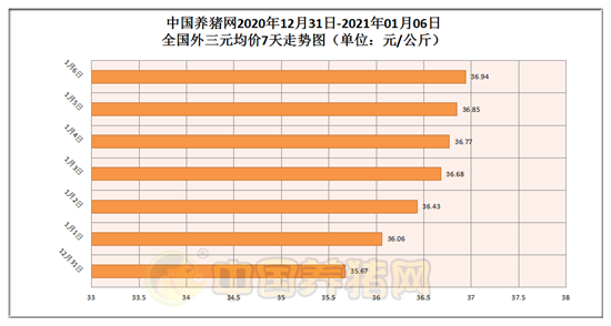 2021年01月06日(星期三),据中国养猪网猪价系统监测全国外三元均价为36.94元/公斤,猪价较昨日(36.85元/公斤)上涨了0.09元/公斤,较上月上涨了3.26元/公斤。